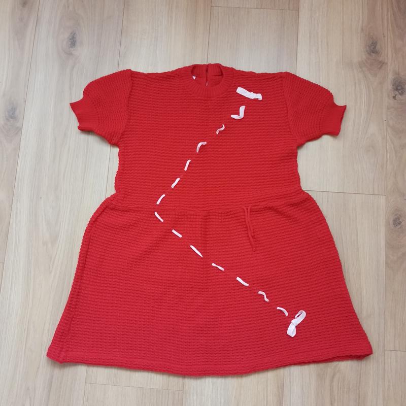 Плаття в'язане. Колір не такий насичений як на фото. Размір 134-140. Довжина 68, пог 38, плечі 33. На талії затягується пояском. Білу стрічку можна легко прибрати. Стан нормальний, без нюансів (плямок, дірочок та катишек немає).