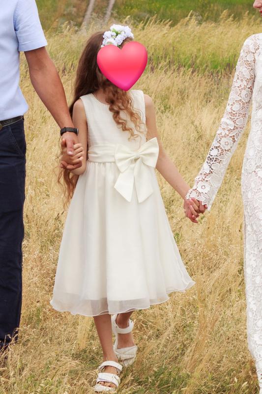 Очень красивое фирменное платье для девочки 7-9р. Длина 82см. ПОГ 31см. ПОТ 28см. Сзади можно затянуть поясом. Цвет айвори.