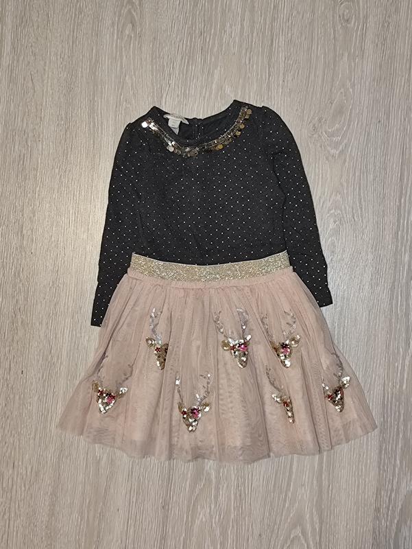 Фирменное платье на 3-4 года. Топ мягкий трикотаж, на спинке застегивается на пуговицу. Пышная фатиновая юбка с аппликациями. Состояние отлично, но есть пара едва заметных нюансов, в носке не заметно Замеры: длина по спинке от плеча 56 см, ширина между подмышками 28 см, плечи 21,5 см, рукав от плеча 32,5 см, по внутреннему шву 23,5 см, длина юбки от талии 29 см