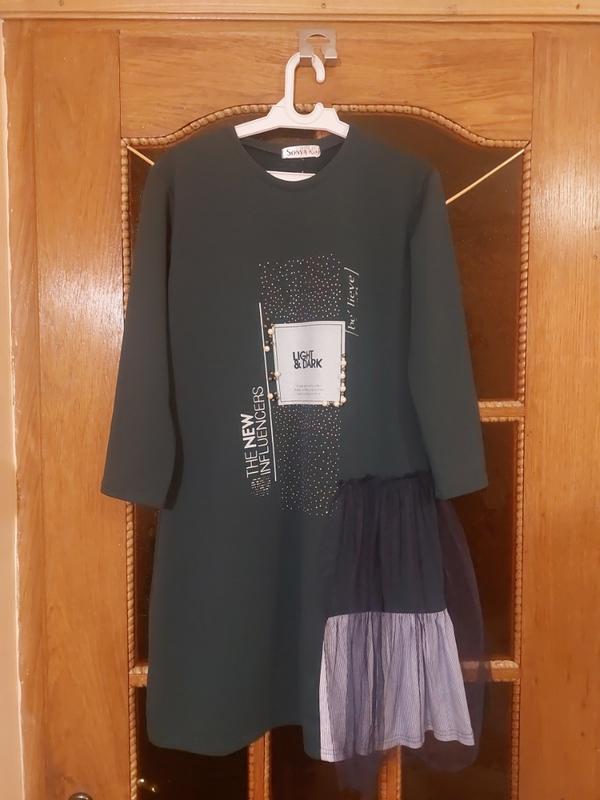 Оригинальное платье на 10-12 лет. Зреного цвета со стразами и бусинами. Рукав 3/4.