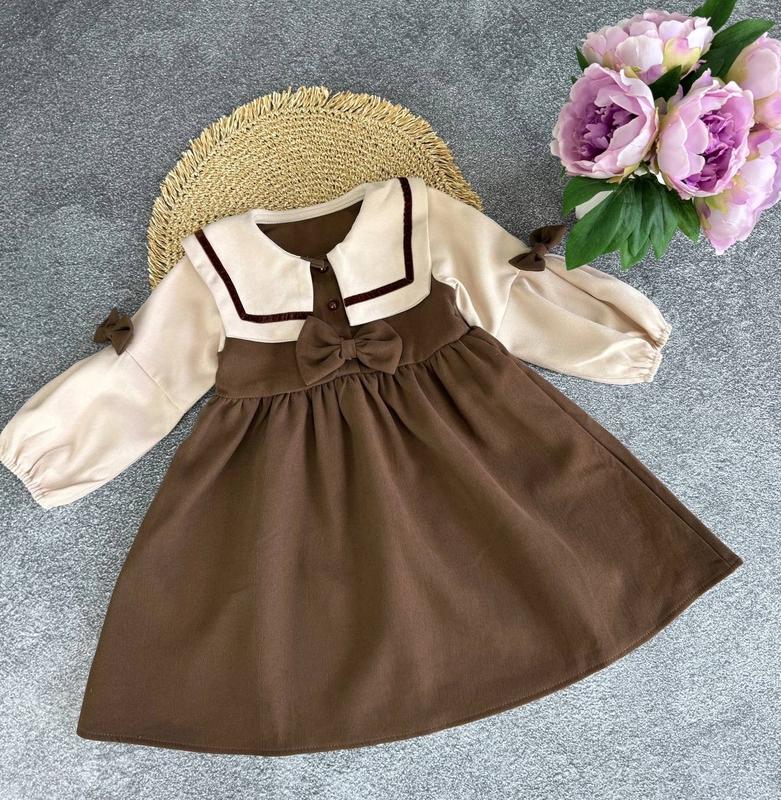 Дуже гарна,якісна осіння сукня Дуже гарний комірець та рукавчики Бантик на шпильці ,можна зняти при бажанні ✔️Неймовірно гарна та стильна. 100 – довжина 54 см, пог 29 см, рукав 32 см (2 шт) 110 – довжина 57 см, пог 31 см, рукав 34 см (4 шт) 120 – довжина 61 см, пог 33 см, рукав 38 см (5 шт) 130 – довжина 64 см, пог 34 см, рукав 41 см (5 шт) 140 – довжина 68 см, пог 35 см, рукав 43 см (7 шт) Замір рукава від плеча
