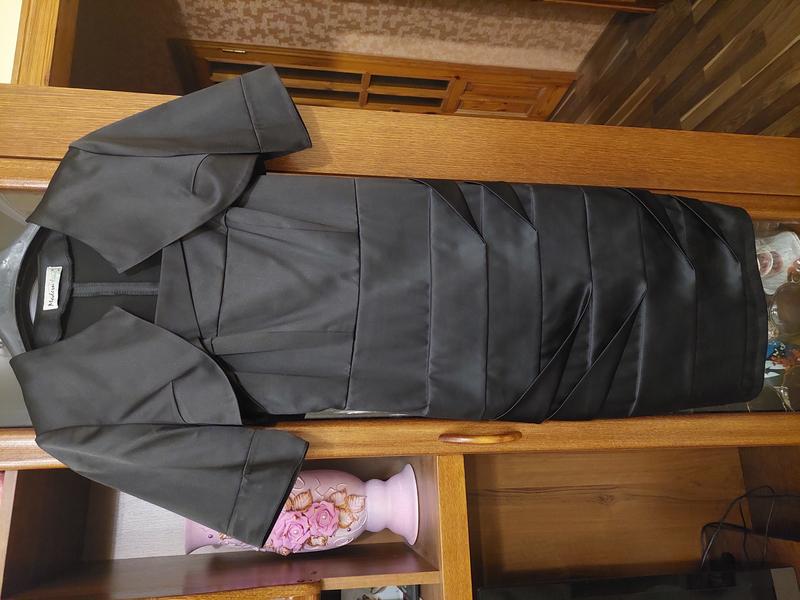 Красивое, черного цвета, двойника-платье с накидкой. Имеет отблеск ткани. Платье-сарафан приталенное, красиво демонстрирует женскую фигуру, 44-46 размера. Комплект выглядит празднично особенно гармонирует с классической женской обувью.