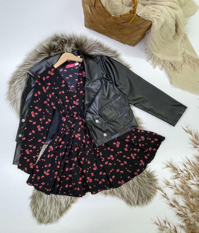 Арт 4531 Новинка Модный комплект для девочки Куртка и воздушное платье ткань супер-софт и эко-кожа платье- на запах, в талии есть резиночка, поясок в комплекте куртка на кнопках без подкладки есть карман смотрится очень нежно, ткань приятная к телу рост/длин.куртки/пог/рукав от горловины/длинны/пог/рукав от горловины Похибка +-2см 140/42/42/58/68/37/55-1шт 146/45/43/61/72/38/58-1шт