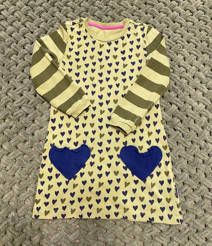 Плаття на дівчинку 104/110 Принт в сердечка Стан гарний, не ідеальний Довжина по спинці 55 см, рукав від плеча - 36 см Вироблено в Україні (Jako-O)