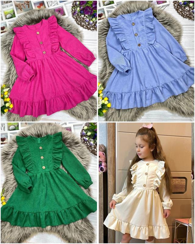 Нарядное стильное платье для красавиц Ткань вельвет, сзади завязывается под поясок, спереди украшено пуговицами, сзади застегивается на молнию Замеры: длина/пог/рукав от плеча 116 - 63/30/39 122 - 66/31/44 128 - 69/33/47 134 - 72/35/49 Sanya