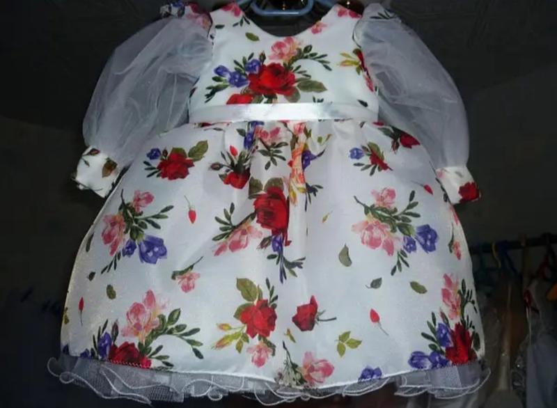 Яркое, красивое и оригинальное платье для девочки на 1-2 года. Юбка очень пышная. В наличии платье длиной 56 см. Платье сзади со шнуровкой. Мерки платья, которая в наличии: по груди максимально 56 см, шнуровкой затягивается до 46 см. Платье нигде не давит, объем по груди и по талии Вы можете отрегулировать сами. Длина спинки = 21 см, длина юбочки= 35 см.
