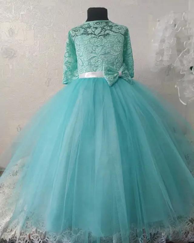 Яркое, красивое и оригинальное платье мятного цвета с гипюром и рукавами три четверти В наличии платье с длиной 94 см. Подойдет на деток 5-7, так как платье сзади со шнуровкой. Мерки платья, которая в наличии: по груди максимально 66 см, шнуровкой затягивается до 54 см. Платье нигде не давит, объем по груди и по талии Вы можете отрегулировать сами. Талия = 64 см, затягивается до 54 см. Длина спинки= 29 см, длина юбочки= 65 Платье сфотографировано на кругах-подъюбника, которые есть в продаже за отдельную плату = 180 гривен.(Но можно и без кольца) Платье имеет 5-ти слойную юбочку: Пышное!!!!!!!!!!!!