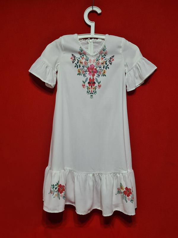 Изысканное детское платье с имитацией вышивки. На 5-7 лет. Длина 80, рукав 20, плечи 29, ОГ 70, ОТ 80, ОБ 120. В идеальном состоянии!
