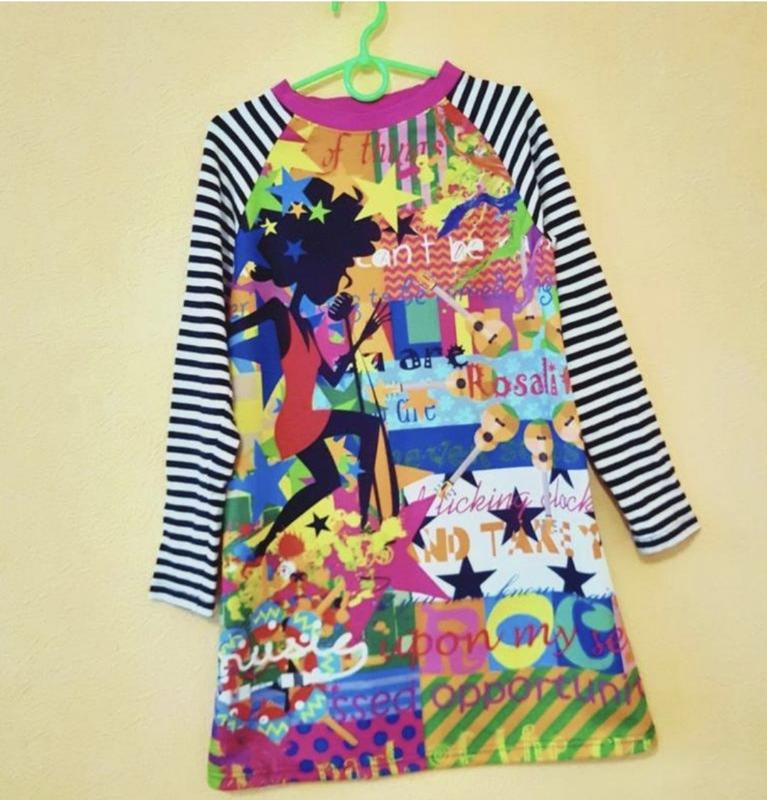 Дуже крута яскрава сукня, стильна. Под кроссовки смотрится 🔥 . Синтетика (цветная часть) комбинированная с трикотажем (рукава) Замеры: длина 64см рукав от воротника 55 Грудь 37