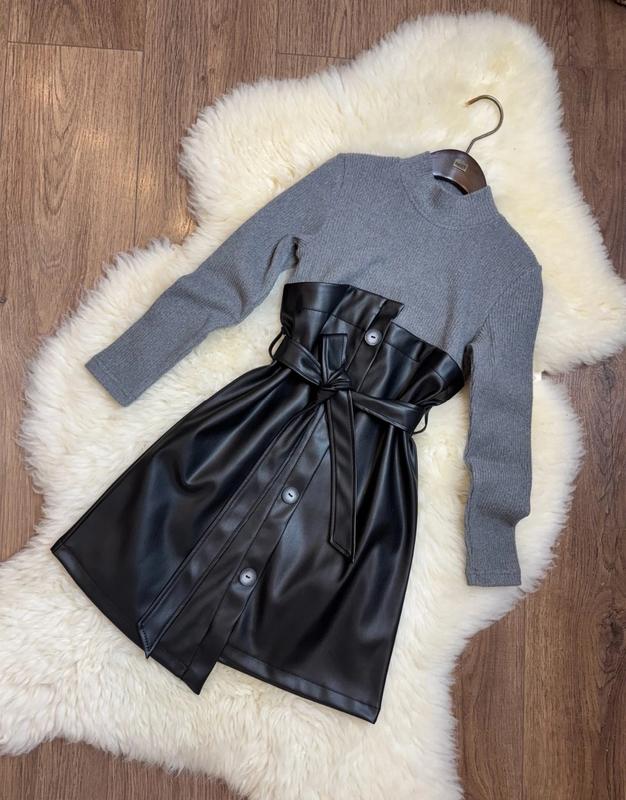 Стильное теплое платье для красавиц 💗 ткань ангора в рубчик + эко кожа на замше завязывается под поясок, украшенная пуговицами Замеры: длина/пог/рукав 140 - 70/36/45 146 - 72/38/48 152 - 76/40/51 158 - 79/42/53 164 - 82/44/55 Ян