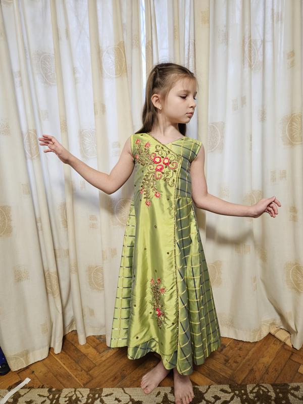 Платье зеленого цвета, хлопковое, много расшитое вышивкой и стразами. В стиле праздничной Индии. Одетые несколько раз. Рост 128-134. Если девочка меньше, то платье будете пол, можно затянуть поясом сзади максимально. Параметри за запитом.