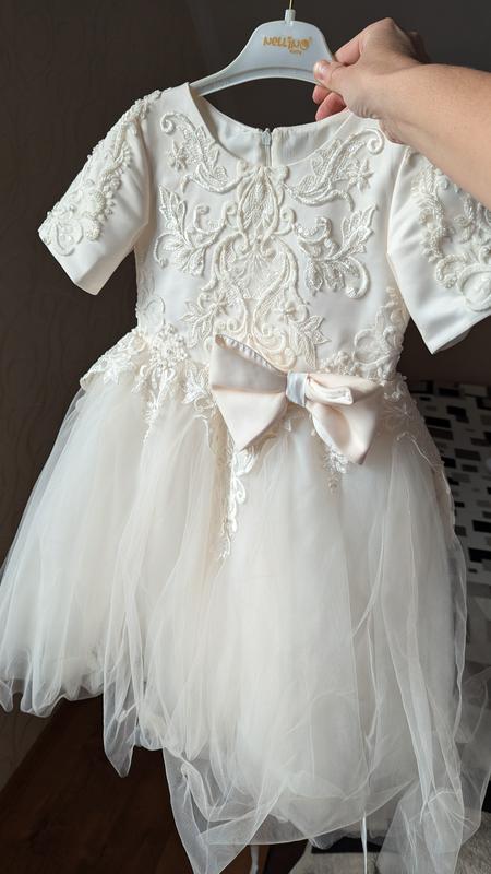 Молочный цвет Состояние нового, одевали на свадьбу и новый год На рост 110-116 но нужно смотреть на замеры Многие слои фатина, качественно пришитый бисер, пятен НЕМЕНО Можно одеть на новогоднее утро Декор на фатине нет Пересила Возможно фото на ребенке и видео