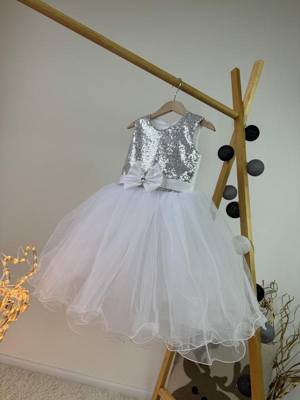 Идеальное пышное платье на любой праздник. Произведено в Украине! Качество -люкс! Низ- несколькослойный фатин, евросетка, подклад- атлас. Идеально держит форму. Сзади- на потайной молнии, дополнительно-корсетная шнуровка. Невероятно переливается на свету. Верх- пайетки. Размер: визуально 4-6 лет. Длина 70 см, полуобхват талии 30 см.