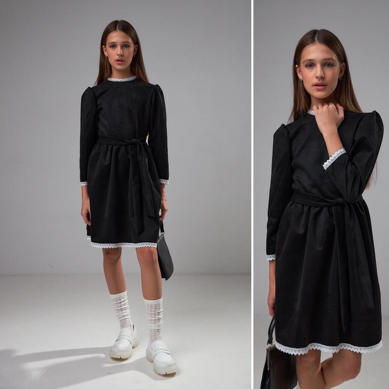 Красивое и нежное платье Ткань замш, приятная к телу Украшена кружевом Под поясок КАЧЕСТВО ЧУДОВА!! РЕКОМЕНДУЮ!!! 134-1шт 140-1шт 146-1шт 152-1шт 158-1шт Длина/пог/рукав 134-70/31/41 140-72/32/42 146-75/33/44 152-77/35/45 158-80/37/47