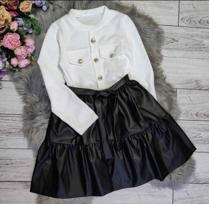 Хорошее платье для юной модницы ткань трикотаж вафелька+ экокожа поясок в комплекті рекомендую!!! замеры: длина/пог/рукав от плеча 128р-66/34/49см