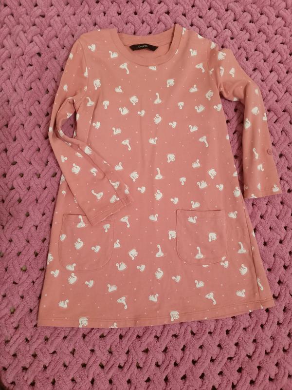 Платье на девочку четырех пяти лет, на рост 104 -110 см. Хорошего качества. Цветовую пудры с белыми лебедями,100% коттон,фирмы george. Длина рукава от плеча 37 см, длина рукава от горловины 45 см, длина изделия по спинке 55 см имеет свободный крой.Также рукав подкачивается на 3/4 имеется застежка.