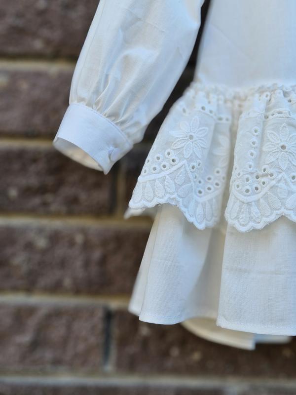 Белоснежное платье из натуральной ткани - легкое, воздушное и очень удобное. Имеет оригинальный крой, украшена прошвой. Рукав длинный с манжетом, застегивается на пуговицу. Подходит как для праздничных событий, так и на каждый день. Материал: 100% коттон Цвет: белый Декор: вышитое кружево, двойной низ Застежка: пуговица сзади 💫 Очень нежная, в стиле бохо - идеальный вариант для фотосессий, праздников или прогулок.