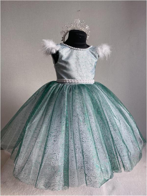 Пушок пришитый, можно при необходимости снять ( под пушком маленький зеленый рукавчик ) Платье имеет 6 юбок! Замеры: ПОГ-29 см ПОТ -28 см Общая длина-70 см