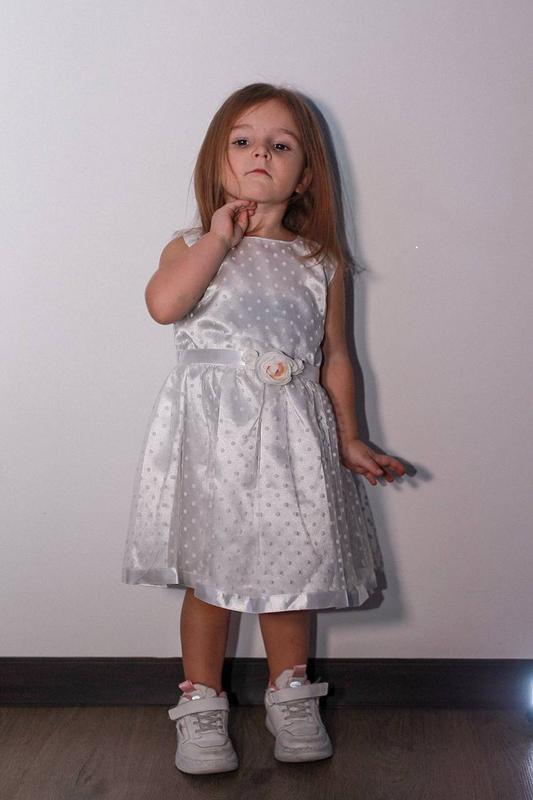 Молочне в горошок Розміри 104,110,116,122, 104- плечі 28, рук 36, по гр 29, дов 60, 110- плечі 29, рук 37, по гр 30, дов 64, 116- плечі 30, по гр 31, рук 38, довж 66, 122- плечі 31, по гр 32, рук 39, дов 68 знизу атлас ,зверху євросітка , замок ззаді і зав‘язується на поясок. ( на голові просто декор)