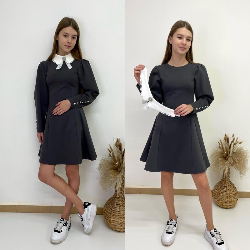 Сукня "Перлинка" тканина Алекс має помірний стрейч за рахунок незвичайного рукава прикрашеним гудзиками,та коміру який додає сукні вишуканності та елегантності ,сукня стає святковою і в той самий час дуже зручною у використанні,на будь який випадок Комір зʼємний прикрашений брошкою СУПЕР ЯКІСТЬ! зріст/довжина/пог/рукав від плеча 140-146/70/30/45-1шт 146-152/73/31/47-1шт 158-164/80/33/53-1шт
