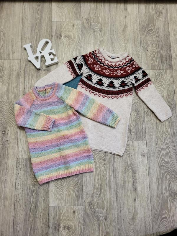 Очень красивые и теплые вязаные платья. Очень качественные и приятные к телу. Новогоднее платье с орнаментом фирмы Tu, и разноцветные платье райдуга Next. Стан идеален. Размер 86-92, полномерный. Новогодняя даже немного крупномерит, будет до 98. Цена указана за одну. Замеры осуществляю по запросу