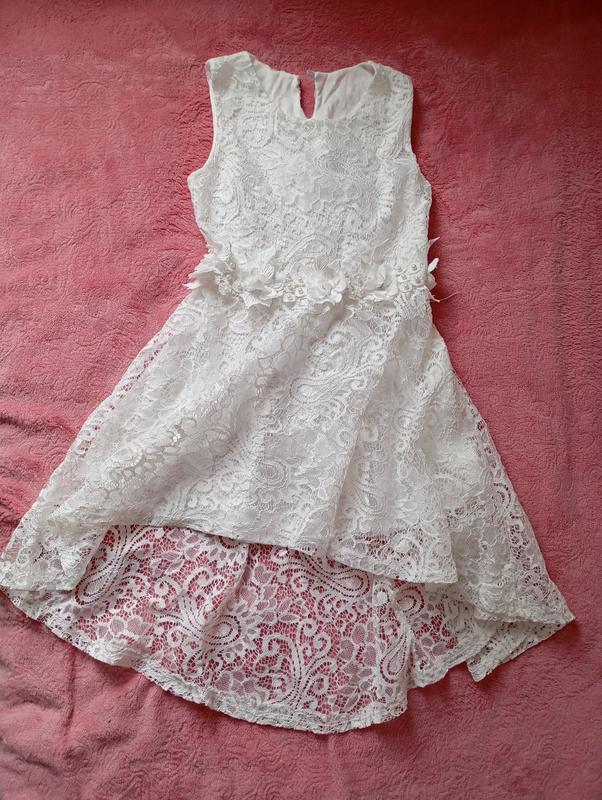 Нежное,нарядное платье для девочки белого цвета, спереди короче, сзади длиннее.На рост где-то 128-134.