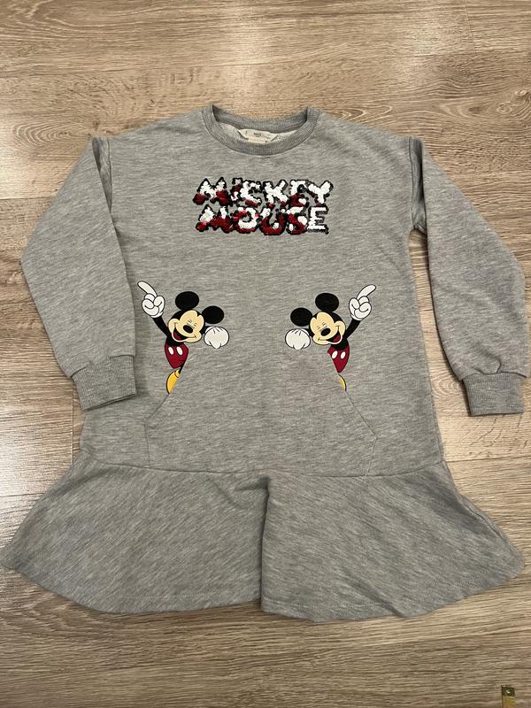 Сукня святкова для дівчинки 9 років, сірого кольору, фірма mango, розмір 134. Довжина сукні 66 см. Талія 41 см. Рукав 39. З кишенею. Малюнок Міккі Маус. Двухнитка.