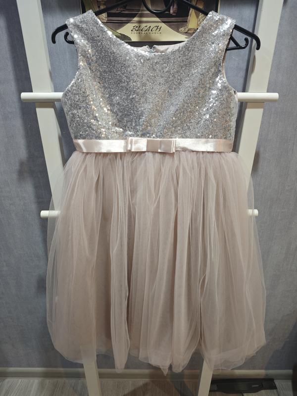 В идеальном состоянии платье с пайетками, юбка фатиновая на подюбнике. Сзади молния и завязки. Цвет дымчатая роза ПОГ 39 см ПОТ 36 см длина 85 см 350 грн.