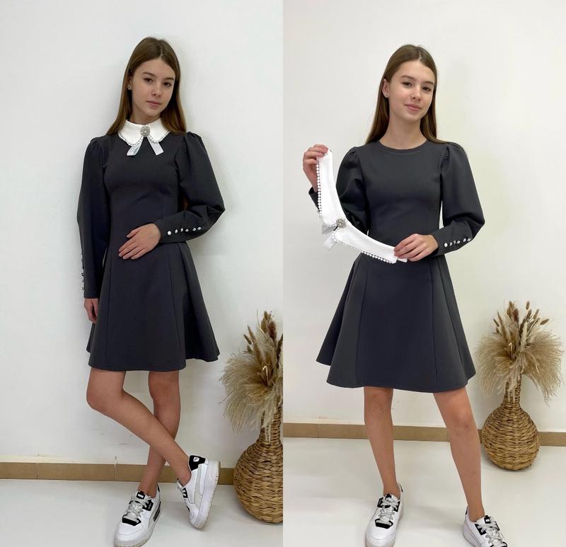 арт 5909 Сукня "Перлинка" тканина Алекс имеет умеренный стрейч за счет необычного рукава украшенной пуговицами, та воротника который добавляет платья изысканности и элегантности, платье становится праздничным и в то же время очень удобно в использовании, на любой случай Воротник земный украшен брошью рост/длина/пог/рукав от плеча 140-146/70/30/45-1шт 146-152/73/31/47-1шт 158-164/80/33/53-1шт Тан