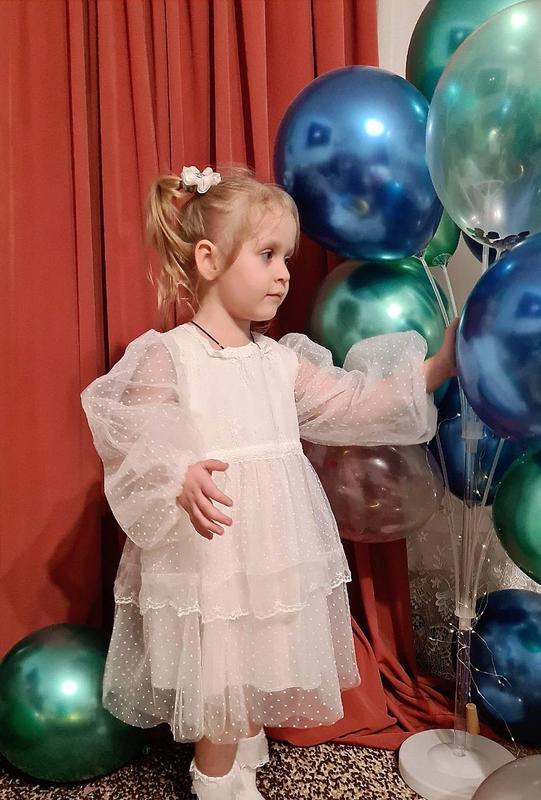 Стильна сукня для принцес Бавовняний підклад + декілька шарів фатину. Стильні об'ємні рукавчики і пишна юбка. По спинці скритий замочок. Замір довжини вказан по під'юбник/по фатін, рікавчик повна довжина від пелечевого шву, ширина - в поясі. 90 - довжина 46/50, ширина 28, рукав 31 100 - довжина 50/55, ширина 30, рукав 35 110 - довжина 53/57, ширина 32, рукав 38 120 - довжина 55/60, ширина 33, рукав 40 130 - довжина 58/63, ширина 35, рукав 42 140 - довжина 62/66, ширина 36, рукав 44