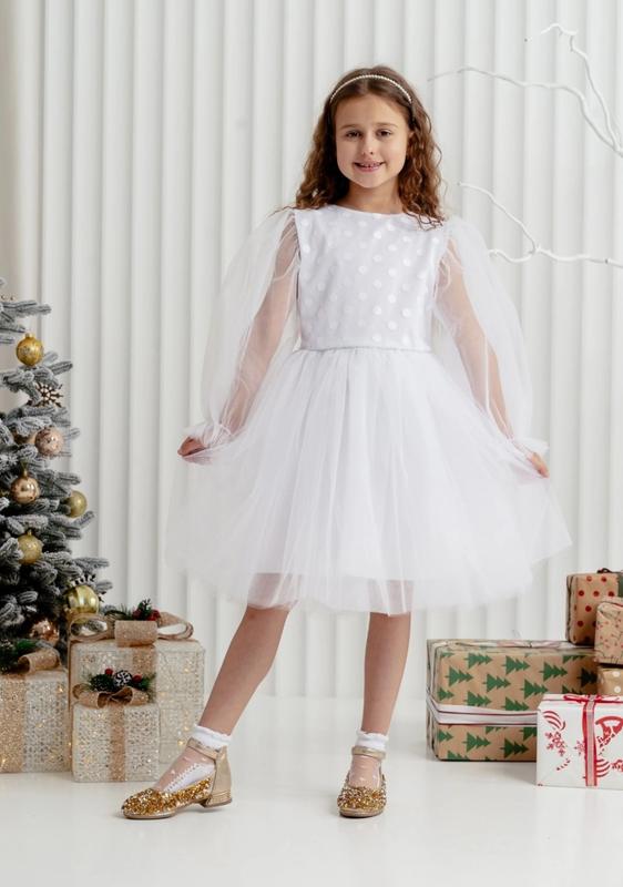Святкова сукня для маленьких принцес! Ткань - евросетка, и х/б подклад. По спинке застегивается на молнию, сзади пояс завязывается на пышный бант. Замеры: 116 длина - 65см, полуобхват груди - 32см, рукав от плеча - 42см. 122 длина - 68см, полуобхват груди - 33см, рукав от плеча - 44см. 128 длина - 73см, полуобхват груди - 35см, рукав от плеча - 46см. Мс