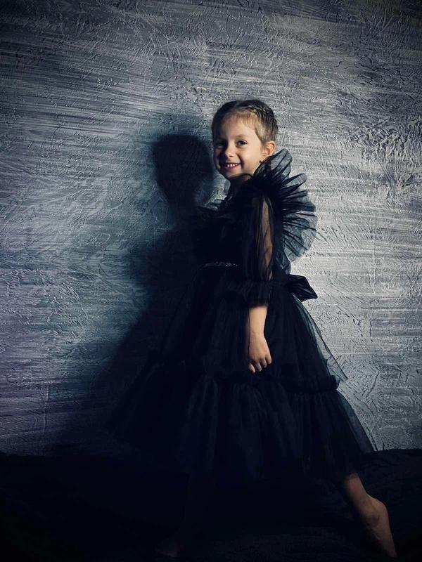 В наличии! Трендовое платье в стиле Венздей. Ткань - королевский атлас, евросетка, и х/б подклад. По спинке застегивается на молнию. Рукав короткий по локоть. Замеры: 122 длина - 71см, полуобхват груди - 33см 128 длина - 75см, полуобхват груди - 34см 134 длина - 78см, полуобхват груди - 36см 140 длина - 83см, полуобхват груди - 38см 146 длина - 87см, полуобхват груди - 40см Размеры в наличии: (полномерные!) 128 134 146