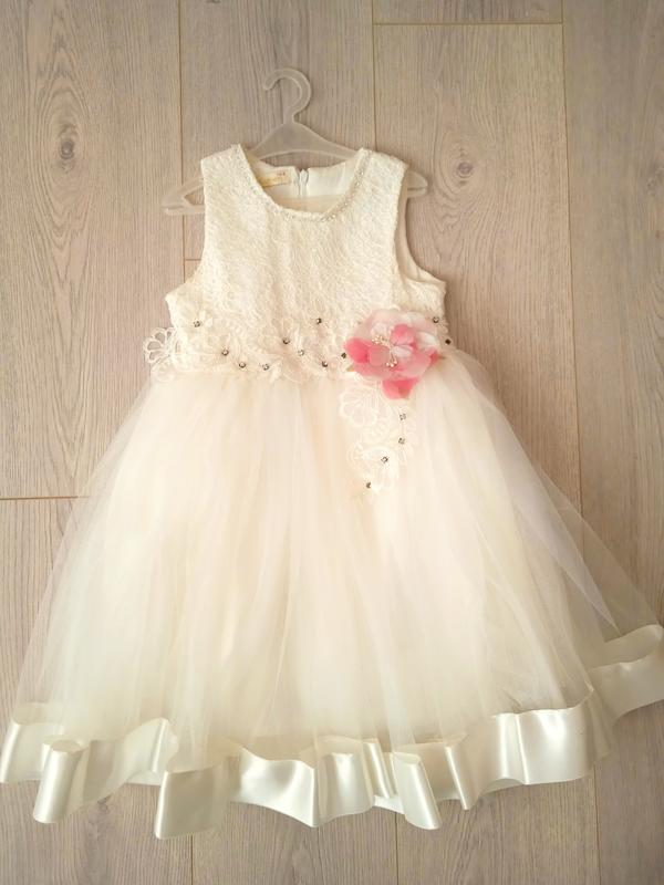 Очень красивое платье для девочки. Отлично подойдет для праздничных событий. Молочный цвет, пышная подюбка, розовый цветочек снимается. Рост 110, длина 67 см, под руками 27 см.