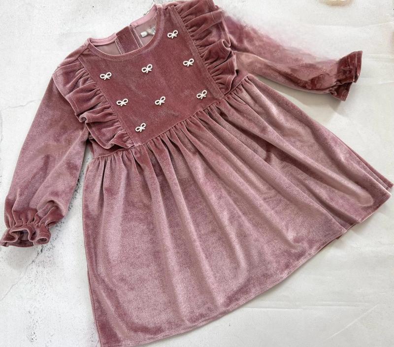 Платье Размеры:92,98,104,110,116; Тканина: бархат (Декор бантики) размер/рукав/длина/плечи/пог 92см-28/46/24/29 98см-30/50/25/30 104см-32/52/26/31 110см-36/54/27/32 116см-38/58/28/33 Арт тю
