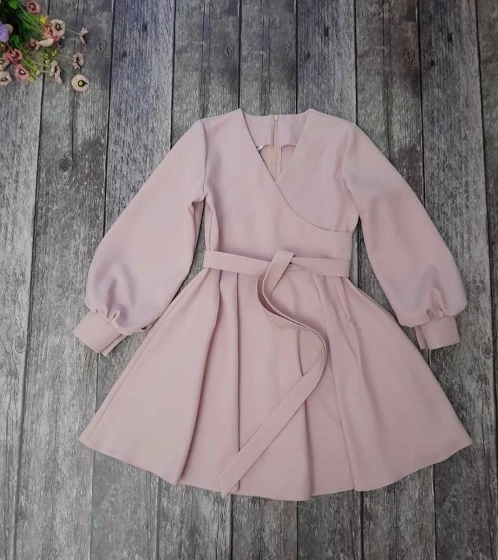 Стильна сукня для модниць По спинці до пояса застібається на блискавку. Спереду на запах. Пояск в комплекті. Тканина- костюмна. Заміри: 140 довжина - 69см, рукав від плеча - 52см, напівобхват грудей - 38см Мс