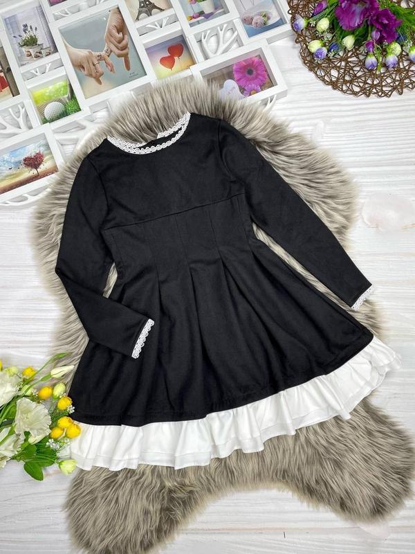 Ткань замш диагональ, украшена кружевом. Сзади застегивается на молнию Замеры: длина/ширина под руками/рукав от плеча 122 - 61/30/41 128 - 66/31/44 134 - 67/33/46 140 - 68/35/49