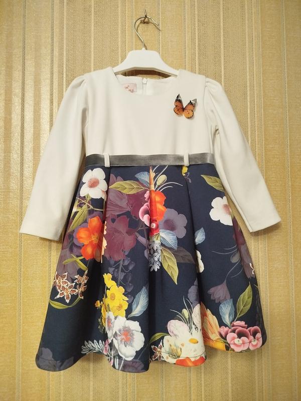 Теплое нарядное платье с подкладкой для девочки, в меру пышное. Можно и носить зимой. Стан очень хорош! Размер 98. Довж. виробу 52 см. Рукав 30 см. Талия де поясок 28-29 см. Стоимость 260 грн.