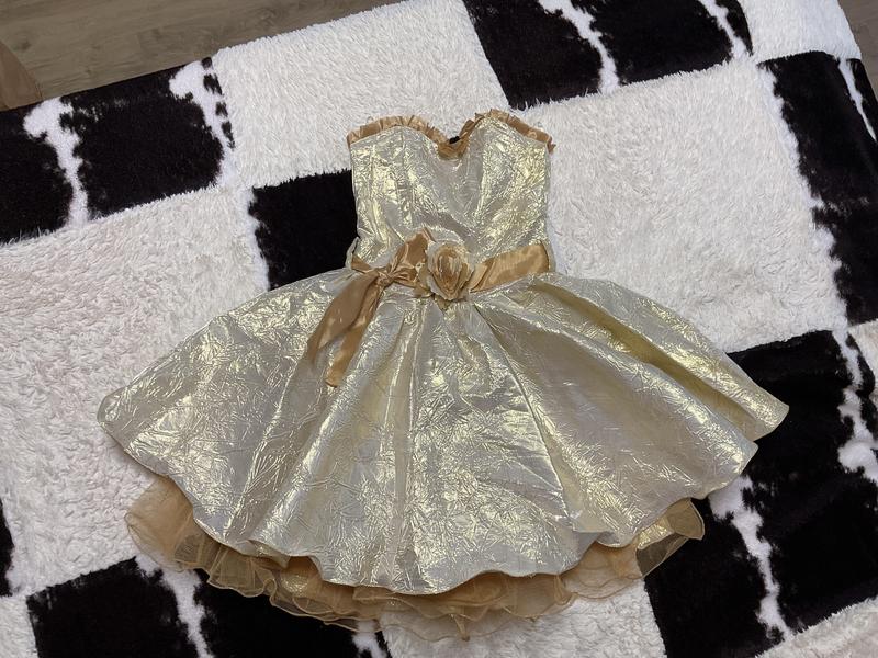 Невероятно красивое и пишет платье на особый день! Золотого цвета, с открытыми плечами. Очень объемная юбочка. Длина изделия по спинке 68 см. Талия полу обхват 34 см. 7 - 10 рочков