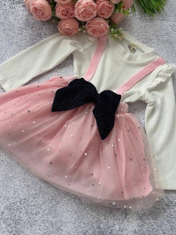 Матеріал верху - трикотаж рубчик - Низ - фатин прикрашений блискітками - Підкладка - бавовна - Бант пришитий,красиво переливається ! - Бант синього кольору як на картинці! Виміри вказані з фатином! 80- Довжина з фатином 45 см рукав від плеча 30 см 90- Довжина з фатином 48 см рукав від плеча 31 см 100- Довжина з фатином 50 см рукав від плеча 32 см 110- Довжина з фатином 51 см рукав від плеча 33 см
