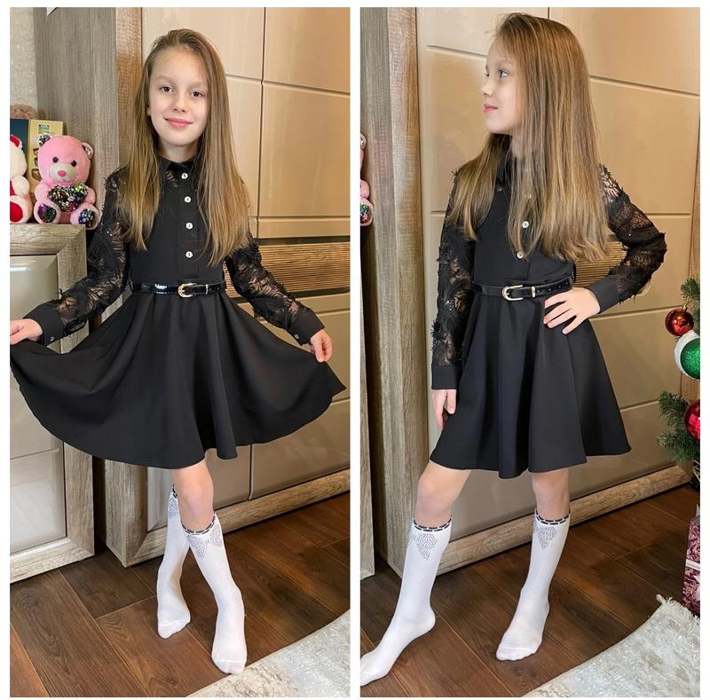 Нежное и нарядное платье для девочек 💗💗💗 Тканина костюмка + рукав 3-D кружево спереди застегивается на пуговицы, поясок в комплекте Замеры: длина/пог/рукав от плеча 122 - 61/32/43 128 - 68/32/46 134 - 70/33/48