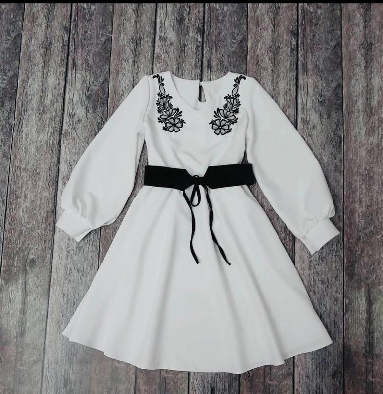 Платье с вышивкой (не рисунок!) Пясок в комплекті. По спинке застегивается на пуговицу. Манжети на гудзиках. Пояс под резиночку. Ткань -костюмная, хорошее качество. Цвет - белый. Замеры: 140 длина - 80см, полуобхват груди - 38см, рукав от плеча - 49см. 146 длина - 83см, полуобхват груди - 40см, рукав от плеча - 51см. 152 длина - 83см, полуобхват груди - 42см, рукав от плеча - 53см. Мс