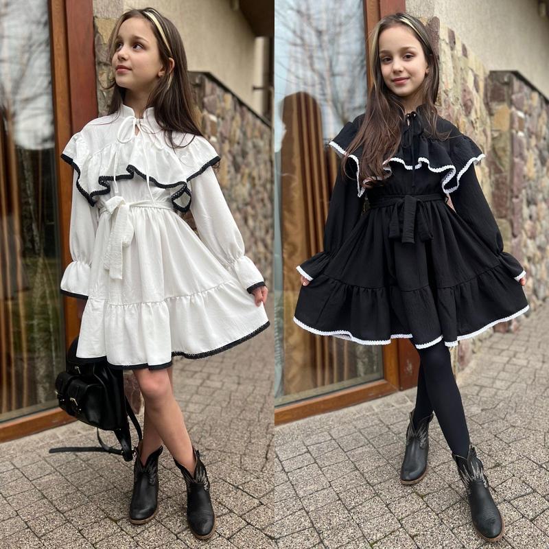 Необычайно красивое платье Ткань: креп-жатка,высокого качества и кружево Талия под резинку,пояс снимается Размеры: 128см 134см 140см 146см 152см Замеры: +-2см допустимая погрешность Рукав от плеча/длина платья/пог 128 - 46/69/30 134 - 48/73/31 140 - 50/76/32 146 - 52/79/33 152 - 54/81/34
