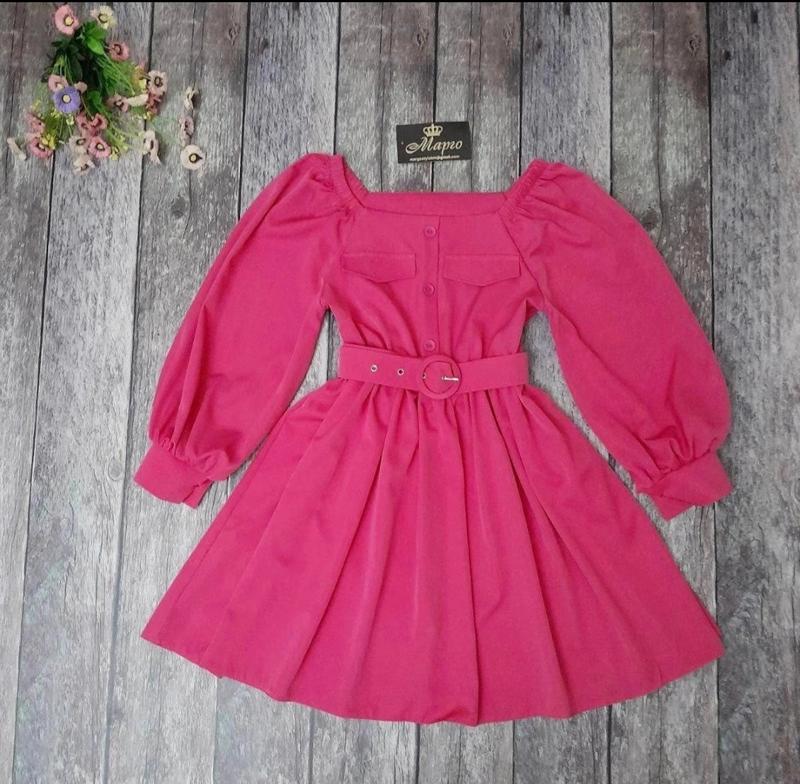 Стильное платье для модниц По переду пуговицы декоративные. Поясок в комплекте. Тканина- костюмна. 158 длина - 82см, рукав - 64см, полуобхват груди - 42см МАЛИНА: