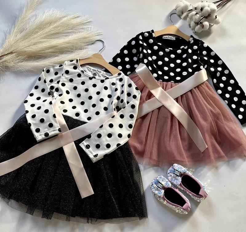 Ніжна сукня для дівчинки Верх - бавовна Два шари фатину Підкладка - атлас Пояс на резиночці В комплекті атласна стрічка Виміри 100- Довжина з фатином 49 см Рукав від плеча 34 см Пояс 21*2 см 110- Довжина з фатином 53 см Рукав від плеча 36 см Пояс 25*2 см 120- Довжина з фатином 56 см Рукав від плеча 37 см Пояс 27*2 см 130- Довжина з фатином 60 см Рукав від плеча 38 см Пояс 28*2 см 140- Довжина з фатином 62 см Рукав від плеча 39 см Пояс 28*2 см
