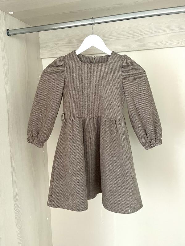 Стильное и комфортное платье, которое будет отлично смотреться в осенне зимний период на праздничные события и на каждый день. Цвет теплый бежево коричневый. На размер 122-128