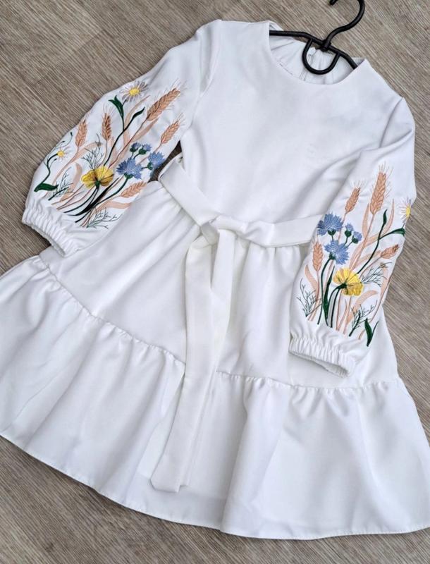 Невероятно красивое и нежное платье На рукавах ВИШИВКА!, не малюнок. По спинке застегивается на молнию. Пояс в комплекті. Ткань - костюмка барби. Замеры: 128 длина-69см, полуобхват груди - 33см, рукав - 45см. 134 длина-71см, полуобхват груди - 34см, рукав - 48см. 140 длина-74см, полуобхват груди - 36см, рукав - 50см. 146 длина-76см, полуобхват груди - 37см, рукав - 52см. Мс