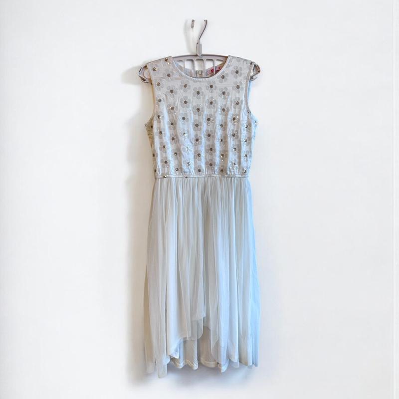 Нарядное, нежное платье на праздник. Верх из нежного материала, низ имеет плотную юбку и украшен фатином. Талия на резинке Удлиненная сзади Нежная, приятная на ощупь Длина: 112 см Плечи: 33 см Талия: 34?см