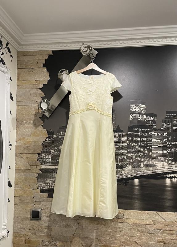 Красивое праздничное нарядное детское длинное платье лимонного цвета, изготовитель Польша, очень красиво смотрится на теле, сзади регулируется корсетом,размер 134/140.Снизу на подкладке.Дочка одевала несколько раз, стан идеален, не является зацепкой отображения на двух последних фото. Замеры:ПОГ 32 см,ПОТ 31 см, длина 98 см.