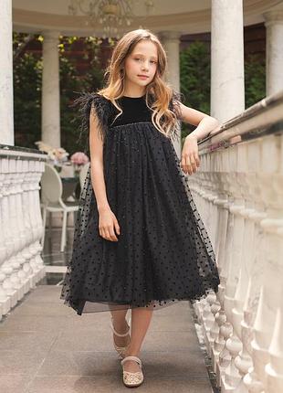 Детское нарядное платье с высокой талией и короткими рукавами. Пышная юбка-миди выполнена из высококачественного фатина с мушкой, а топ – из бархата. Рукава украшены перьями. Размер: 32 Возраст 6-7 лет