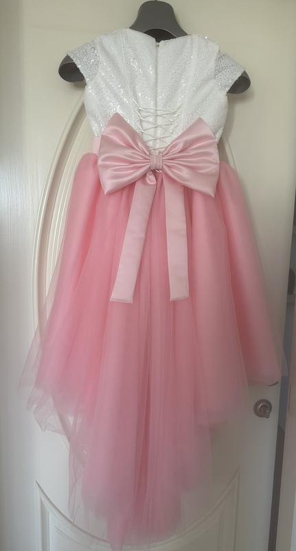 Очень красивое, стильное праздничное платье. Купили на выпуск младшей школы. Было одето один раз. Талия 32 см Полная длина по спине 114 см Остальные замеры указала на фото